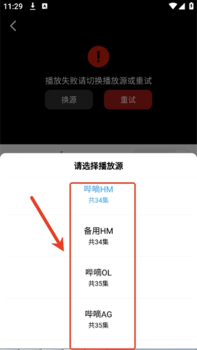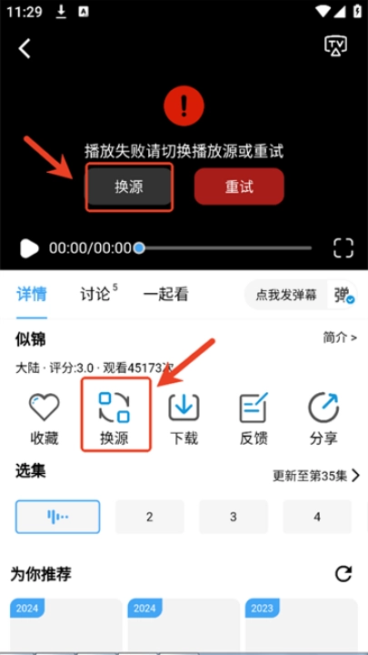 1、如出现不能正常播放的问题时,点击“换源”;