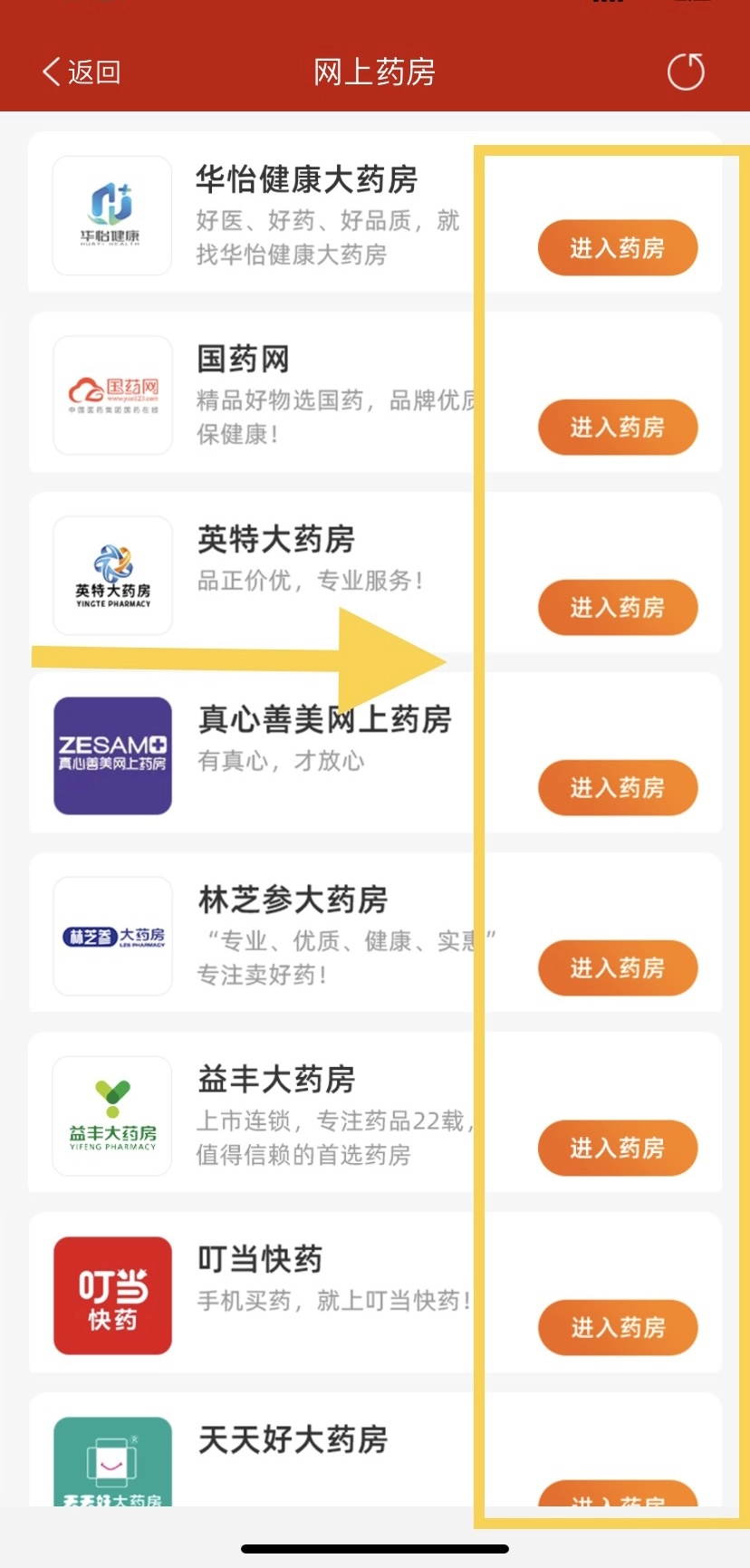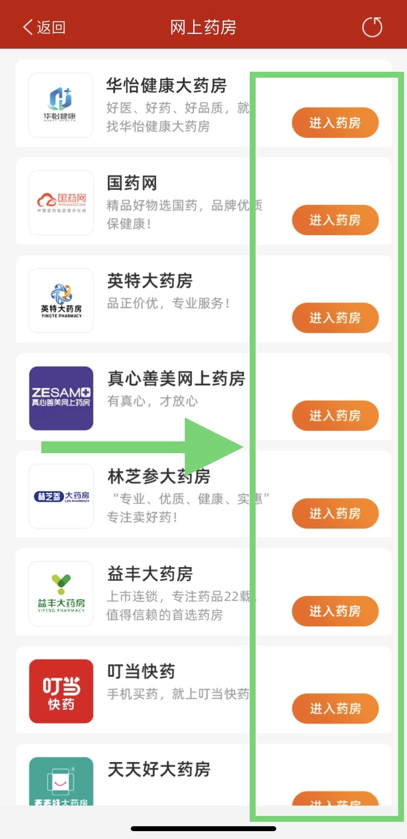 第二步:直接选择对应网上药房,点击“进入药房”