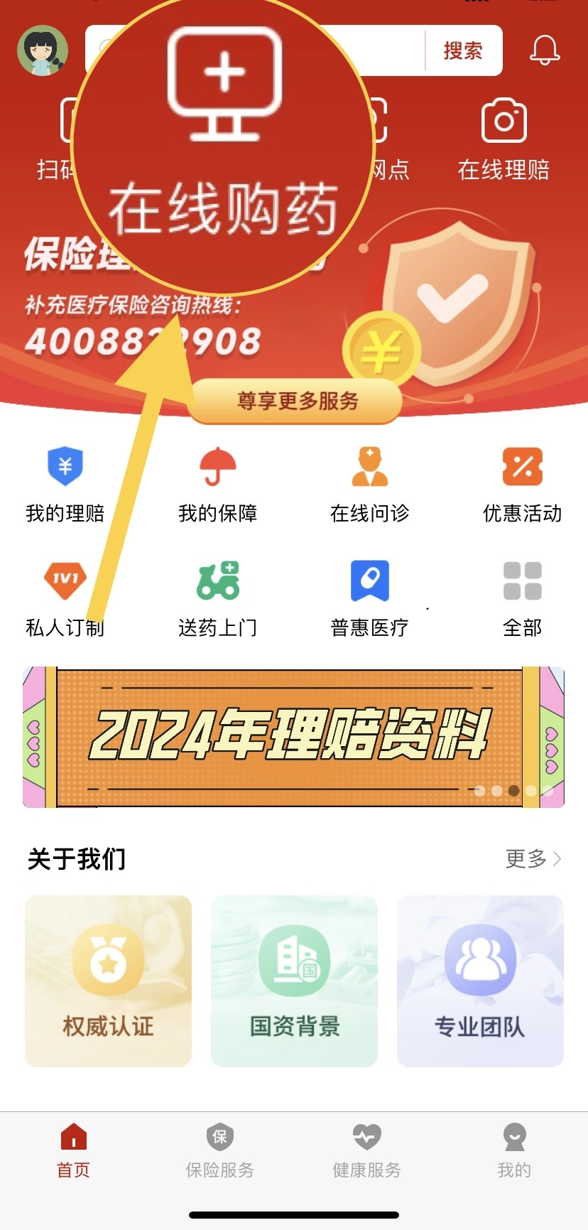 第一种方式:在安诺保APP的首页,直接点击“在线购药”选项。