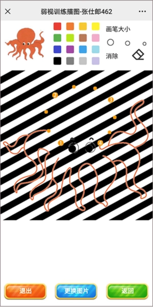 从左至右的第一行,依次为参考图片、16个色块、3种画笔大小以及消除笔。中间部分是动态黑白斜条光栅,用于描画图片。而最下方则设有退出、更换图片和返回这3个按钮。