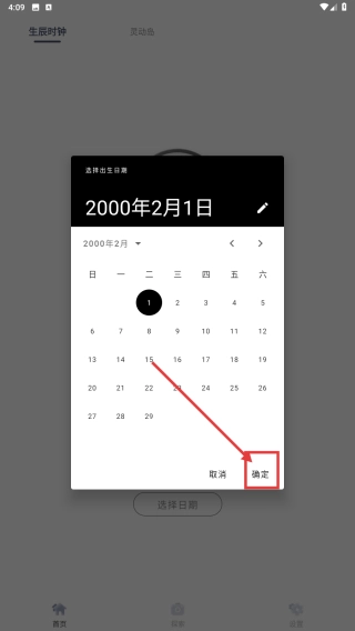 2、在日历弹窗选择生日如2000年2月1日,点击确定保存。