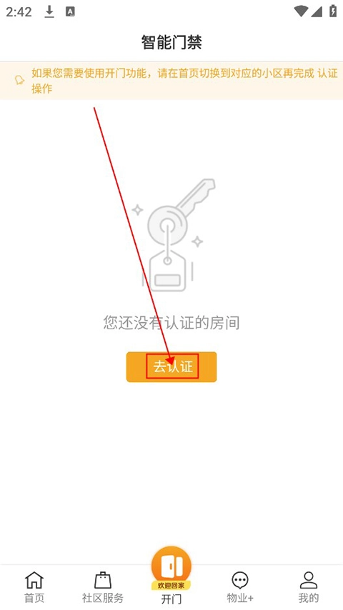 2. 在弹出的智能门禁界面上,点击屏幕中央的“去认证”选项,就能前往认证。