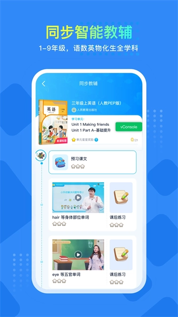 同步学模块采用趣味化与高效化相结合的方式,针对学生的课内知识展开训练,助力学生实现更高效且更有趣的学习。