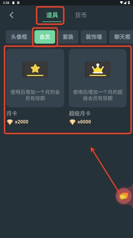 4.点击道具--会员,选择购买月卡或超级月卡。