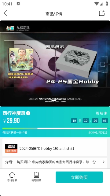 4、挑选自己感兴趣的卡牌商品,点击其封面即可进入查看详情,如图片所示。在此页面,你既可以咨询客服,也能够立即购买。