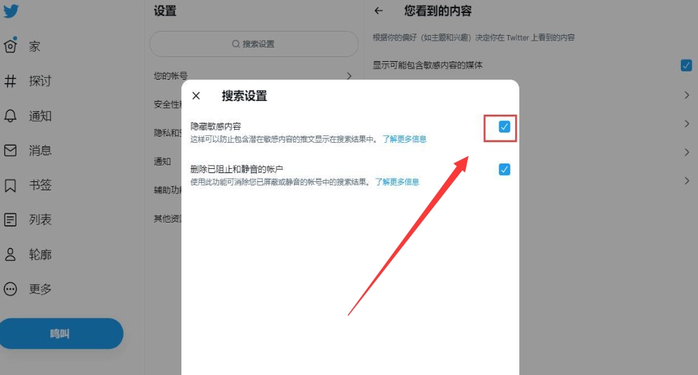 \\n 4. 在“您看到的内容”栏目列表,勾选“显示可能包含敏感内容的媒体”,然后再点“探索设置”;\\n