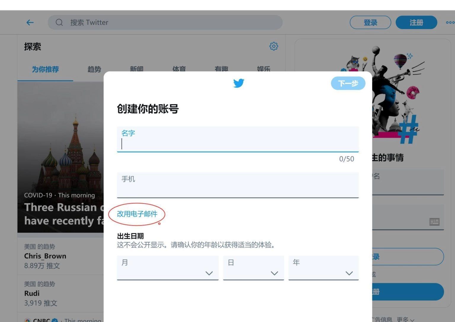 \\n 点击“注册Twitter”或者\\"创建账号\\"。\\n