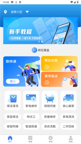 1、打开软件,进入首页,开始选择小区,然后进入帮买东西。