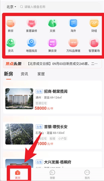 3、于首页能够浏览新房、家居装修、文旅、海外等多种服务,顶部功能区可便捷直达常用入口。