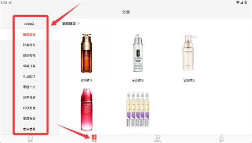 2、进入首页后点击底部分类图标,左侧将展示各类商品分区导航。