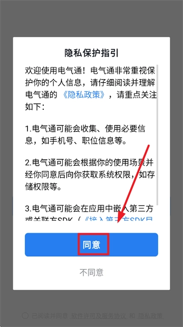 首先安装电气通,安装完成后打开该应用,打开时需先同意隐私保护指引。