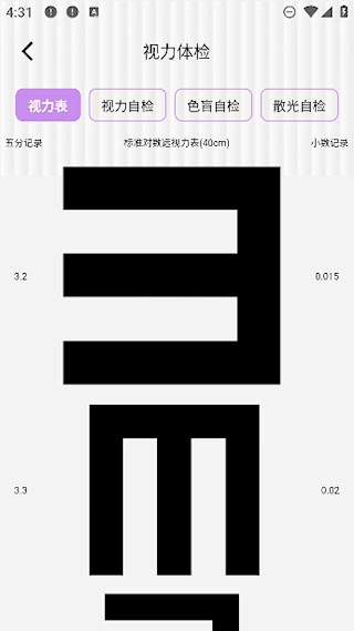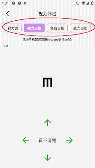 3、该板块还提供多种视力评估项目,包括色觉检查、散光测试等辅助功能。