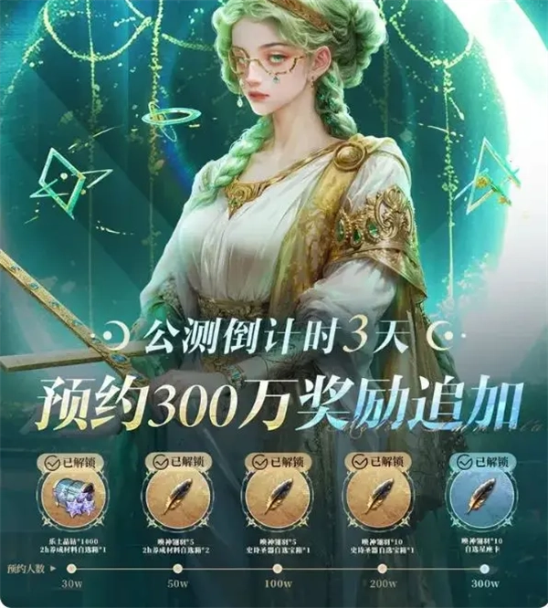 1. 全渠道预约达成300W里程碑奖励:公测开服后长期开放领取,奖励包含乐唤神翎羽*30、2小时养成材料自选箱*3、史诗圣器自选宝箱*2、乐土晶钻*1000以及自选星座卡*1 。