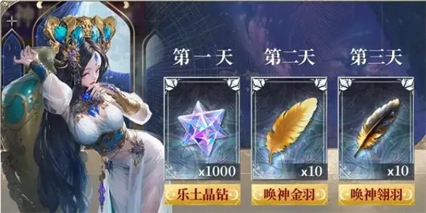 开服前三日签到送大量乐土晶钻、唤神翎羽。