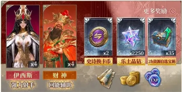 3.福利活动:创建角色后 14 天内推进主线章节,可获强力神明伊西斯(强力射手)、财神(回能铺助),大量换卡币、晶钻、2h资源自选宝箱,直升传说;